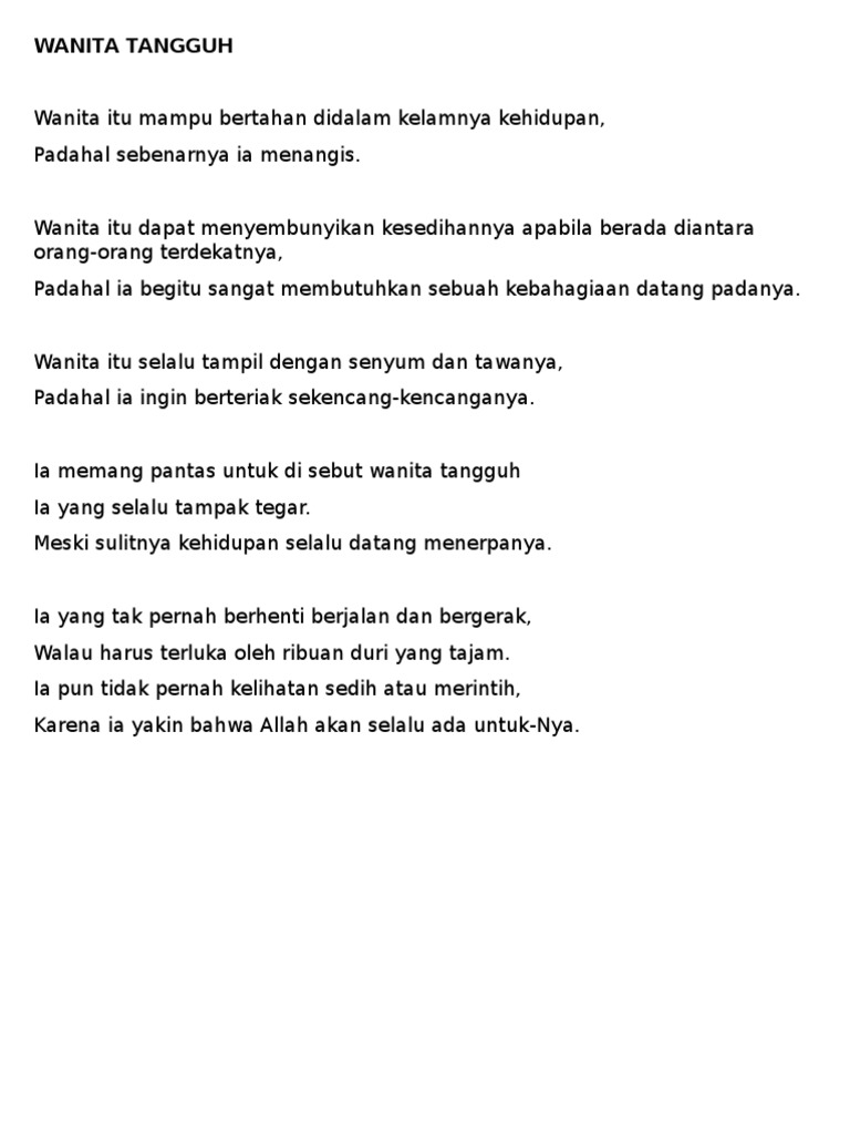 Puisi tentang wanita tegar. Demikianlah ulasan kali ini mengenai Puisi untuk Istri tercinta dan tersayang menyentuh serta romantis. Menjadikanku wanita yang tegar. Di tambah lagi lokasinya yang.